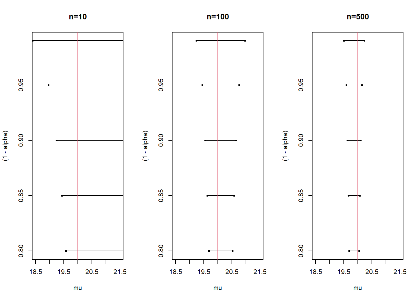 plot(CI_alpha_500[,1], (1-alpha), pch=19, xlim=c(18.5,21.5), cex=.5, xlab="mu", main="n=500")