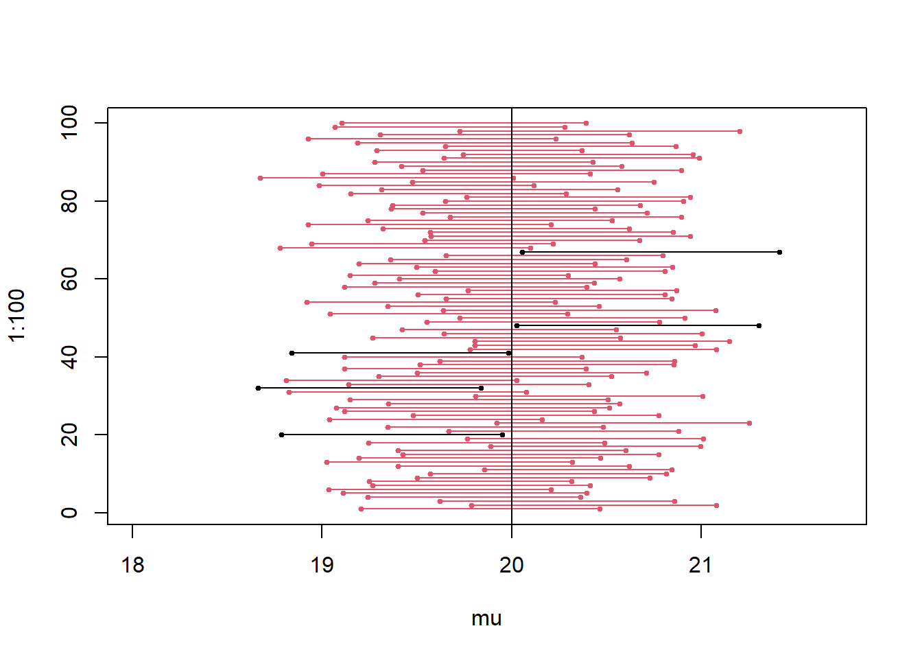 plot(CI[1:100,1], 1:100, pch=19, xlim=range(CI), cex=.5, col=as.factor(coverage+1), xlab="mu")