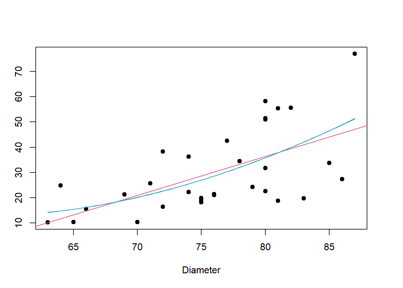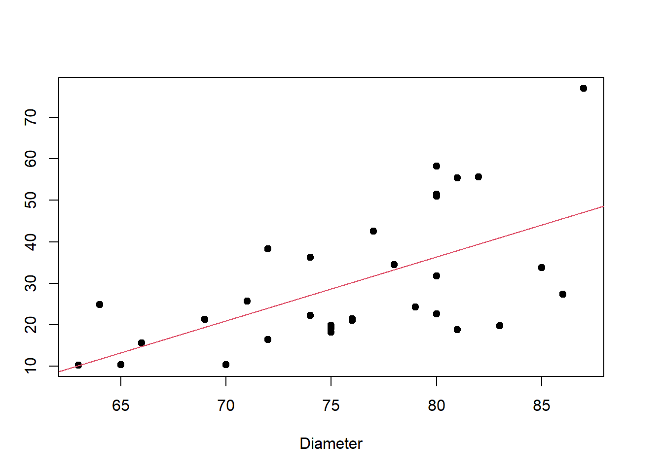 # Let's look at the regression line:plot(trees$Diameter, trees$Volume, pch=19,ylab="Volume", xlab ="Diameter")abline(lm1, col=2)# Compute the predicted values of the model:coef(lm1)[1] +coef(lm1)[2]*trees$Diameter