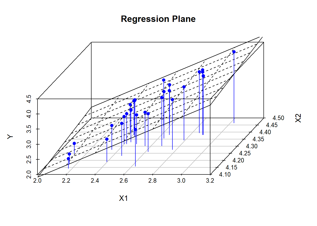 plot3d <-scatterplot3d(X1, X2, Y, angle=60, scale.y=0.7, pch=16, color ="red", main ="Regression Plane")plot3d$plane3d(lm_log, lty.box ="solid")plot3d$points3d(X1, X2, Y,col="blue", type="h", pch=16)