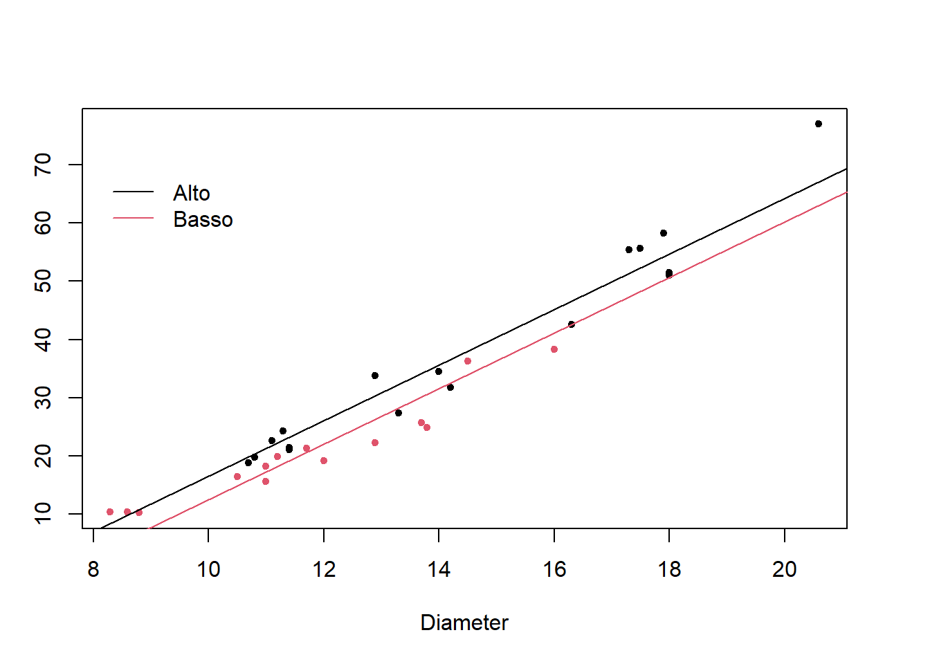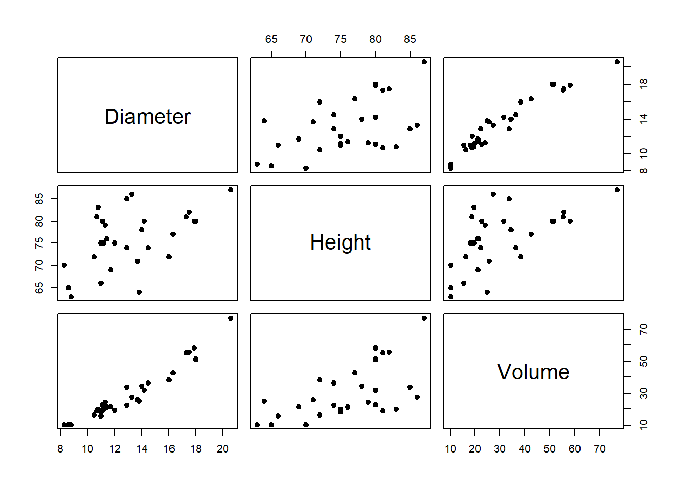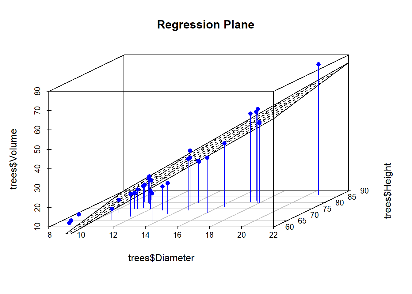 ################################### Let us suppose that a tree is a cylinder.# We know that the volume of a cylinder# is V = pi * (Diameter/2)^2 * Height# Then log(V) = log(pi/4) + 2log(Diameter) + log(Height)Y <-log(trees$Volume)X1 <-log(trees$Diameter)X2 <-log(trees$Height)lm_log <-lm(Y ~ X1 + X2)summary(lm_log)