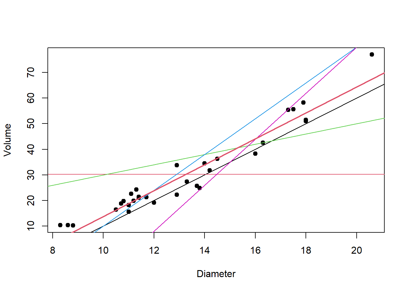 ##################################### Regression line:# We can consider several lines passing through the scatterplot:plot(trees$Diameter, trees$Volume, pch=19,ylab="Volume", xlab ="Diameter")abline(a=-40, b=5, col=1)abline(h=mean(trees$Volume), col=2)abline(a=10, b=2, col=3)abline(a=-60, b=7, col=4)abline(a=-100, b=9, col=6)# Let's estimate the regression line,# that is the BEST line passing through the data:lm1 <-lm(Volume ~ Diameter, data=trees)summ1 <-summary(lm1);summ1