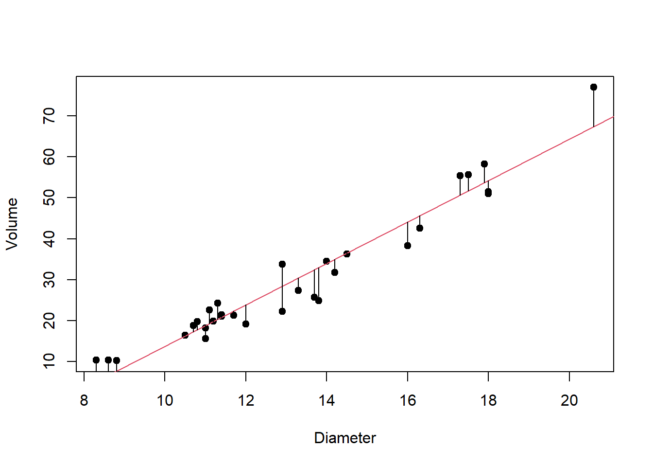 #### Residuals:# Once we fitted the model, we can compute the residualse <- trees$Volume - y_prev# Graphical representation of the residuals:segments(x0=trees$Diameter, x1=trees$Diameter,y0=trees$Volume, y1=y_prev)# Estimate of sigma^2SSres <-sum(e^2)sigma2_hat <- SSres/(n-2)sqrt(sigma2_hat)